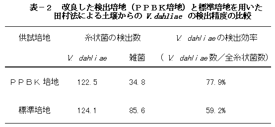 | (4) | 以上の結果に基づき標準培地の改良を行なったところ、PCNB水和剤とブラストサイジンS乳剤をそれぞれ標準培地の添加量の1/2と2倍に変え、これにさらにカスガマイシン塩酸塩液剤を1000μl/l添加したPPBK培地がV. dahliaeの検出培地として最も優れていた(表−2)。 |