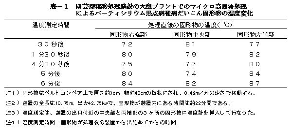 | (1) | バ−ティシリウム黒点病罹病だいこんを破砕・搾汁した後の固形物をマイクロ高周波処理することにより、固形物の温度は70℃以上に達した(表−1)。 |