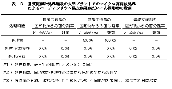 | (2) | バ−ティシリウム黒点病罹病だいこんを破砕・搾汁した後の固形物をマイクロ高周波処理することにより、固形物中の病原菌を完全に殺菌できた(表−2)。 |