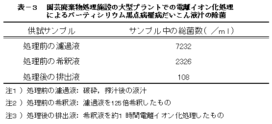 | (3) | バ−ティシリウム黒点病罹病だいこんを破砕・搾汁した後の液汁を、流量調整槽で希釈し電離イオン化処理することにより、液汁中の総菌数を約100分の1に除菌できた(表−3)。液汁中の病原菌に対する除菌効果は不明であるが、総菌数の除菌効果と同程度(約100分の1)に除菌できるものと考えられる。 |