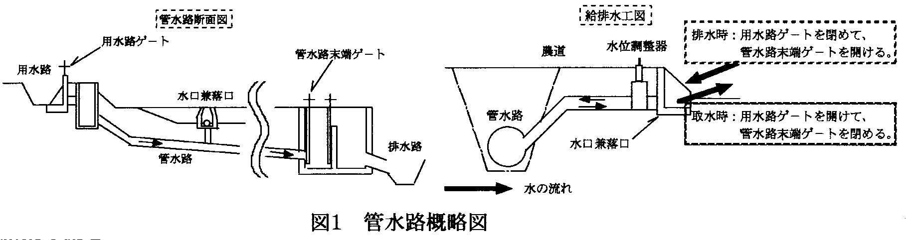 2)管水路概要:管水路延長〜263.1m、口径〜250mm、勾配〜1/516、材質〜塩化ビニル、用排兼用の機能(図1)