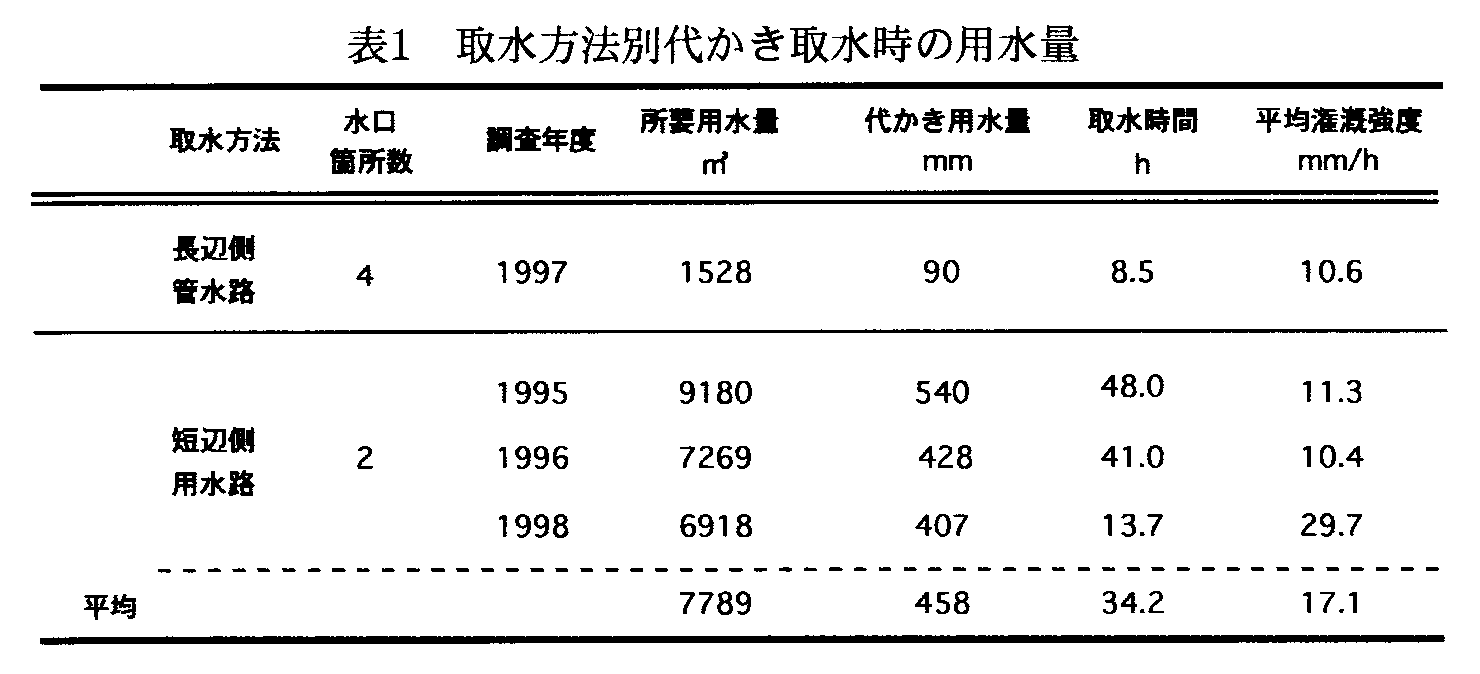 2)代かき取水時において、ほ場の短辺側からの取水(水口2箇所)では用水量がかなり大きくなり、また灌漑強度を3倍に上げても取水時間の短縮(約70%)が見られたものの、用水量はほとんど変わらなかった(表1)。