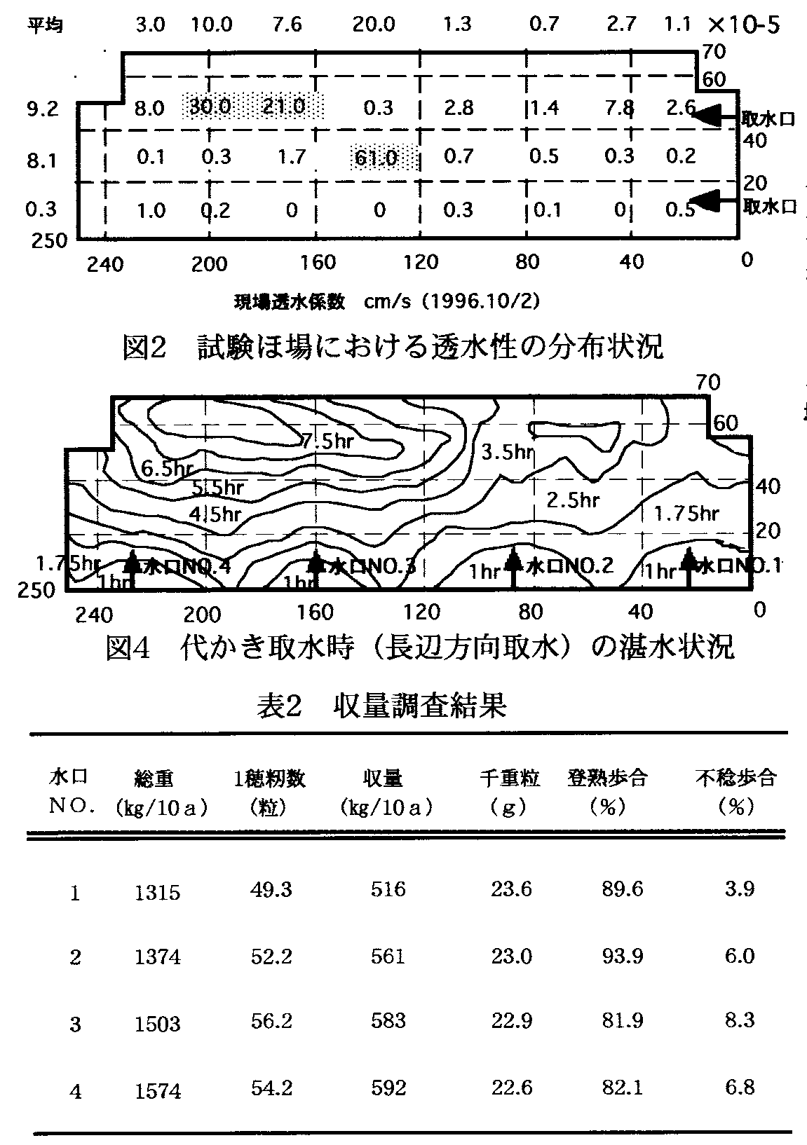 6)管水路における4箇所の水口のうち、2箇所(No.1,No.3〜図4)で水管理を行ったが、収量に対する取水の影響は少ないと推察され、地力ムラなどの影響が大きいと考えられた(表2)。