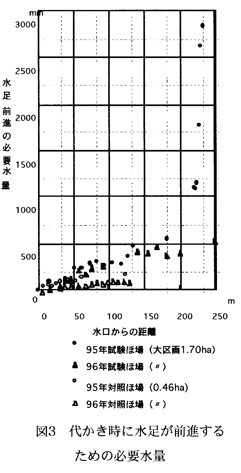 3)代かき時におけるほ場の短辺側からの取水において、水足が前進するための必要水量(一定時間内に水足が延びた面積でその時間内の用水量を割った数値)が、水口から50mを過ぎると250mmを越え、さらに200mを過ぎると1000mm以上必要とした。これは、ほ場の透水性の大きな部分の影響と考えられた(図3)。