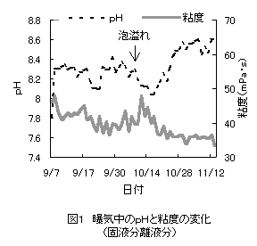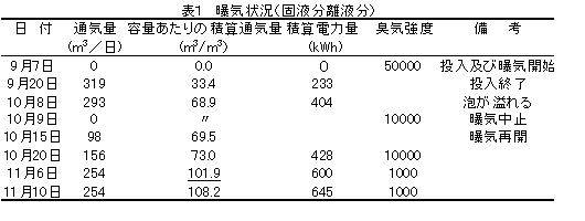 2)固液分離液を用いた曝気では曝気中のスラリーの温度は曝気開始1か月後に最高23℃まで上昇した。このとき貯留槽から泡が溢れた。曝気中の水分は96%前後、ORPは-450mVから-350mV、pHは8.0から8.6に上昇、DOは泡が溢れたあとは0.3mg/L〜0.37mg/Lの範囲で安定していた。粘度は原料で50mPa・sであったが、その後減少し、40mPa・s以下になった。泡は、20リットルのオイルを投入して、消泡した。原料の臭気強度は50000であったが、曝気2ヶ月後で積算通気量が貯留容量の約100倍に達した時点で1000にまで減少した。このときの体積あたりの積算電力量は3.7kWh/m3でエジェクタ方式の1/4になった。この期間に全窒素量は約8%減少した。