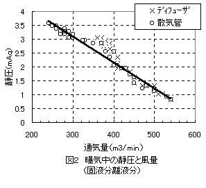 4)散気管に詰まりが生じ、通気量が小さくなり、通気静圧が大きくなった。スラリーの粘度、比重が水よりも大きいことや詰まりや配管の圧力損失、供給電圧の低下などの影響で、公表性能より曝気能力が低下することが推測されるので、貯留深さの2倍の水中静圧で必要空気量の4割増の能力を有するブロアを選択する必要がある。