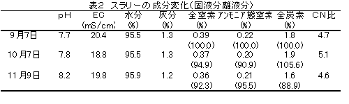 3)臭気や成分変化を判断すると、固液分離液に比べ、生スラリーの曝気効果は小さかった。固液分離液の積算通気量が貯留容量の約100倍に達した時点で乾物積算風量比(積算風量/乾物重)は2.6m3/kgになったが、生スラリーではこの値に達するのは困難なので、固液分離した液分を使うことが前提条件となる。