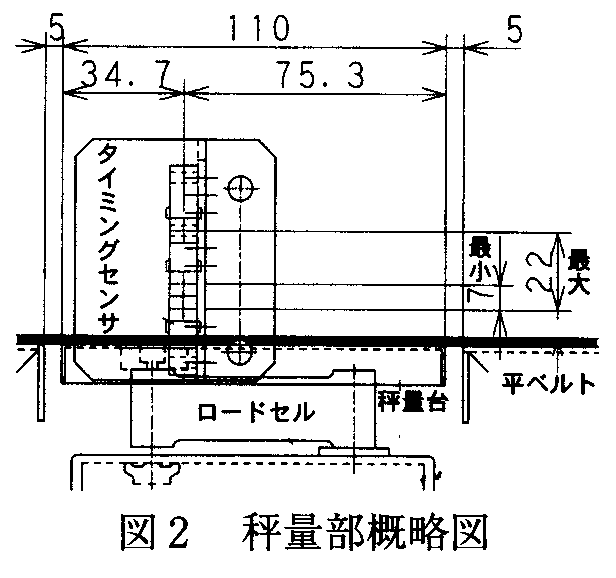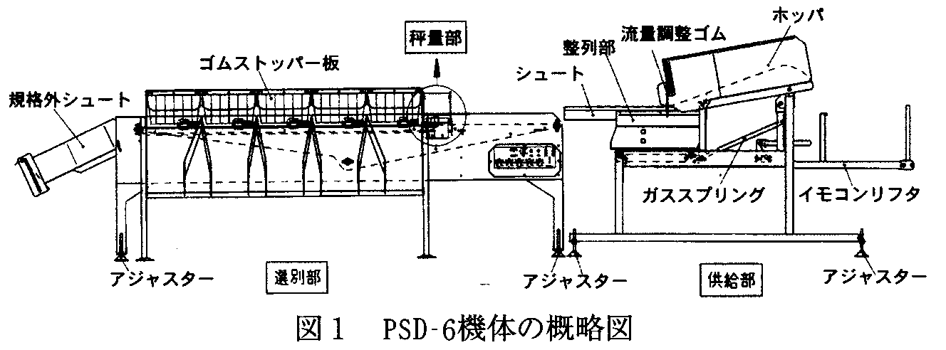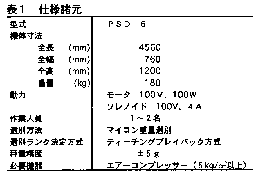 1)供試機は馬鈴しょ塊茎を6段階に重量選別する選別機である、馬鈴しょ塊茎を選別部に供給する「供給部」と供給された馬鈴しょ塊茎をロードセルで秤量し、各規格の選別口にエアー吹き付けにより排出する「選別部」からなっている。馬鈴しょ塊茎はゴム突起が整列したシュートから整列・供給され、供給スピードは振動数で調節する。供給された塊茎はロードセルを通過するときに±5gの誤差範囲で秤量される。秤量台の寸法は11cm角である。エアー噴出口は各排出部に3個あり必要に応じて閉塞することができる。