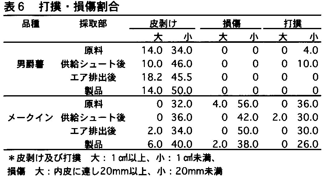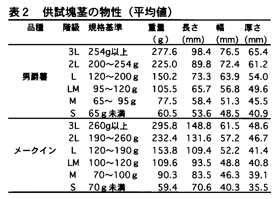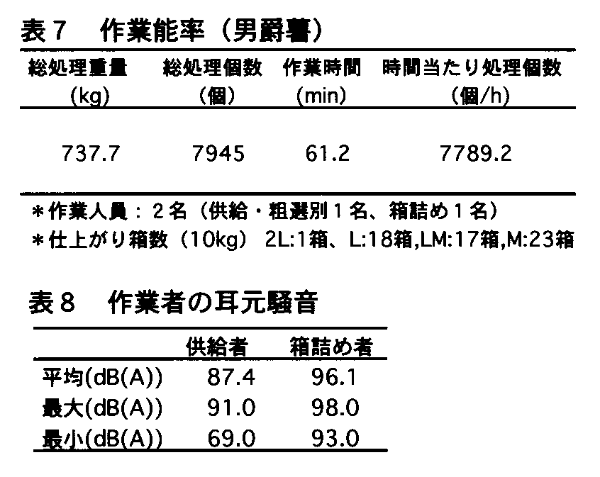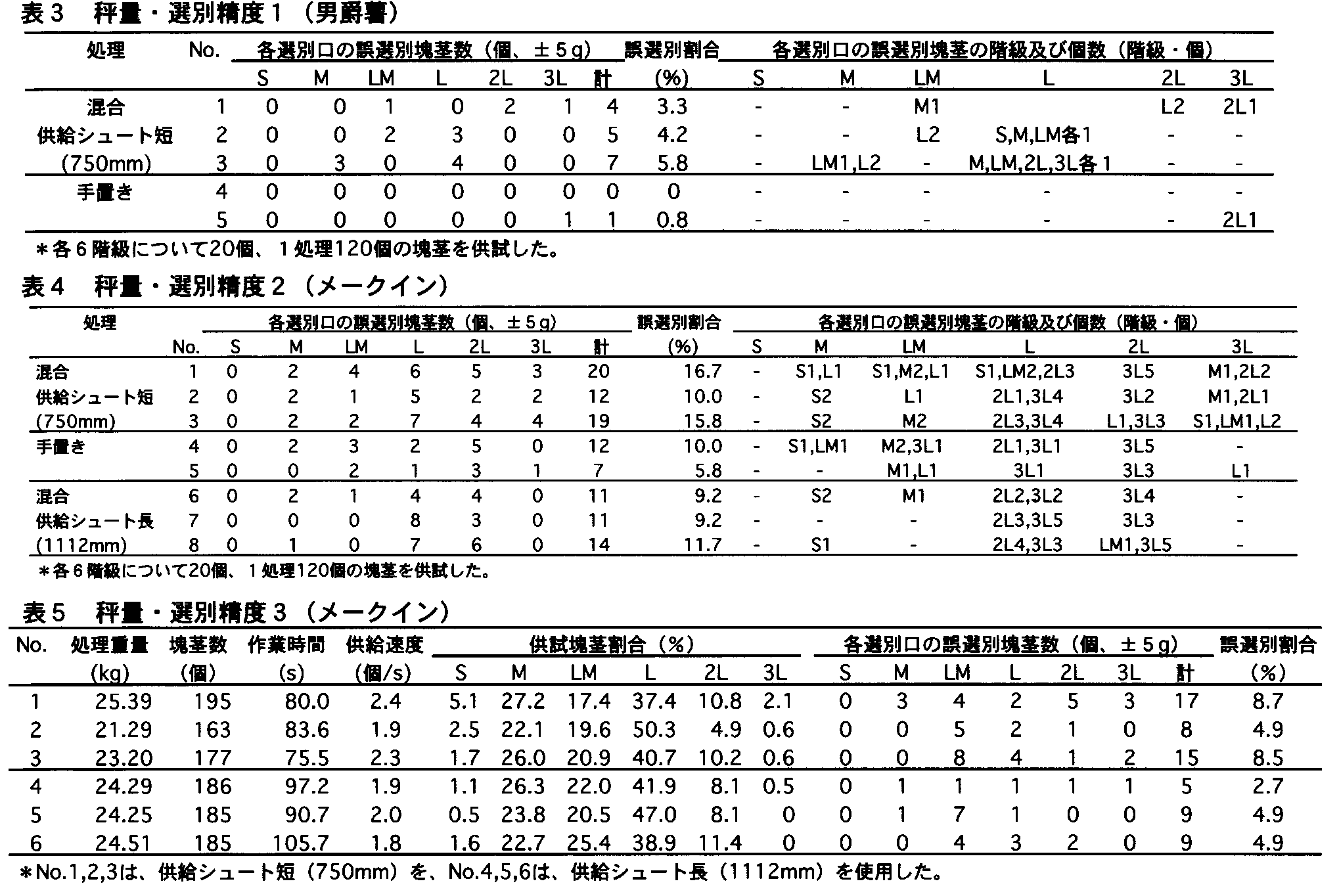 5)作業人員2名で7945個(737.7kg)の塊茎の選別作業に61.2min要し、時間当たりの処理個数は7789個/hであった。