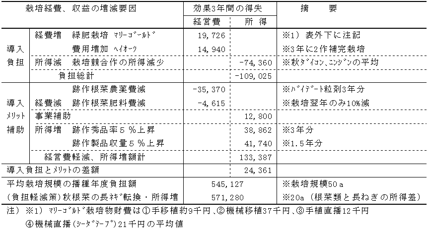 表 1 根菜類野菜栽培におけるマリ-ゴ-ルド、緑肥導入と費用、収益の増減