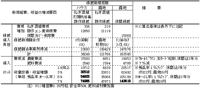 (2)長ねぎ混植栽培、緑肥導入の実態と経営経済的評価:事例農家の実態から混植栽培、緑肥導入の経営経済的な得失を算出すると表2となり、以下の特徴があげられる。①長ねぎ混植栽培の導入負担は、費用、労力とも著しく少なく、栽培競合作物の所得減少もないため、導入による農薬費の減少分のみで経済的には十分カバー出来る。②ハウス太陽熱消毒と跡作緑肥(a)、露地の跡作緑肥(b)及び休閑緑肥導入(C)については、競合作物の所得減少額が小さい(a)及び、費用減少や収量改善効果の大きい(C)では3〜7%の収量面の改善効果が上がれば経済的にペイする結果となる。