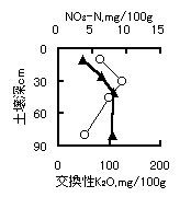 1)現地調査: 糞尿を多量施用している22戸の農家を調査した。糞尿施用量は最大で牧草地(表面施用)で120t/ha、とうもろこし畑で200t/haであった。調査圃場は全般的に表層土壌の養分含量および粗飼料のK含量が高い傾向があった。一部とうもろこし圃場(スラリー200t/ha施用)で心土層の硝酸態窒素・交換性K含量が極めて高く(図1)、地下水汚染の危険性が示された。