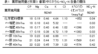2)牧草のミネラル・イオンバランス・硝酸態窒素: 化学肥料標準量に糞尿を上乗せして春施用したところ堆肥20t、尿10t/haといった比較的少量の施用でも、1番草中のCP、K、NO3-N含量、イオンバランスが顕著に上昇する例が見られ(表1)、堆肥を施用する場合は施肥標準に沿った減肥の必要性が再確認された。