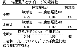 4)収穫時の堆肥混入: Cr標識した堆肥を用いてハーベスタ収穫時の混入量を調査したところ、わらを多く含んだ生堆肥で散布量の13〜17%、腐熟した堆肥で2〜7%が混入した。堆肥を3〜7%混入させて調製したサイレージは酪酸含量の増加(表2)、嗜好性の悪化(表3)がみられた。