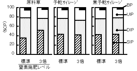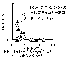 3)牧草サイレージのタンパク質・繊維の分解特性、硝酸態窒素: 窒素多肥(標準量の2〜3倍)により原料草のタンパク質分解特性(図2)は溶解性分画の増加等の影響がみられたが、そのような傾向はサイレージには必ずしも反映せず、サイレージ調製条件が分解特性に影響していることが示された。窒素多肥により原料草中に蓄積した硝酸態窒素はサイレージ調製により低下し、高水分条件のものほど消失する傾向が見られたが、確実に消失するには至らなかった。また硝酸態窒素が消失したサイレージはアンモニア態窒素が高く(図3)、発酵品質が劣ることが示された。