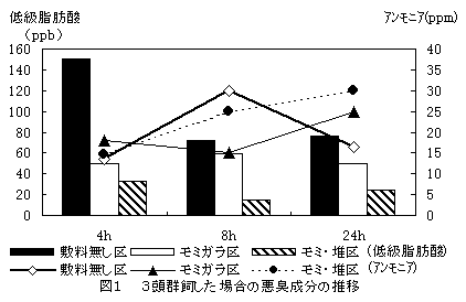 2)(1)ビニールで覆った豚房中で肥育豚3頭を群飼した場合の低級脂肪酸とアンモニア濃度を測定したところ、敷料を用いることにより低級脂肪酸濃度は低下し、その効果はモミガラよりもモミガラ・堆肥等容混合物の方が高かった。敷料のアンモニアに対する抑制効果は見られなかった(図1)。