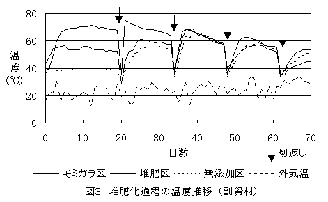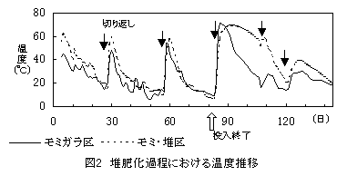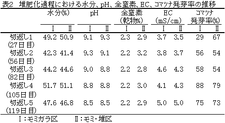 (2)敷料として使用したモミガラおよびモミガラ・堆肥等容混合物を堆積したところモミガラ区、モミ・堆区、いずれも順調に発熱し(図2)、切返し2回目以降のコマツナ発芽率にも違いが無く(表2)、両区とも同程度に腐熟が進行した。