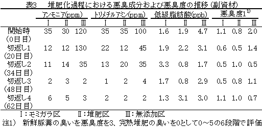 3)堆肥化の際の副資材として豚糞堆肥を用いたところ、発酵温度は副資材としてモミガラを用いた場合には及ばなかったが、副資材を用いない場合より高温になった(図3)。試験開始当初、無添加区に比べモミガラ区、堆肥区で悪臭度が低く、副資材を用いることで悪臭が低減された(表3)。