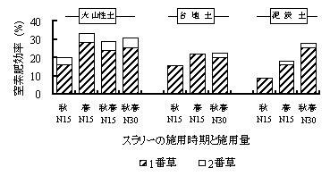 図3 スラリーの施用時期、施用量と窒素肥効率の関係
