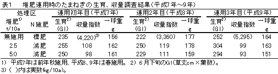 | 試験2: | 4カ年にわたり、中央農試圃場(褐色低地土)において、たまねぎを供試した。堆肥施 用量は無施用、2.5(連用)、5.0(連用)t/10aの3水準を設定し、堆肥連用時の施用限界量 について収量および窒素負荷量から検討した(平成7〜10年)。 |