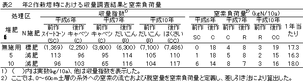 年2作栽培において堆肥5tを連用しても、収量の低下および窒素負荷量の増加等が認められなかったことから、堆肥5tの連用は可能であると結論された。
