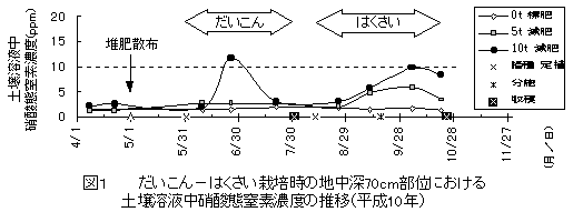 | 試験3: | スイートコーン、キャベツ、だいこんおよびはくさいの組み合わせによる年2作栽培を行った (北長沼圃場)。堆肥施用量は無施用、5、10t/10aの3水準を設定した。収量、窒素負荷 量および土壌溶液中の硝酸態窒素濃度から年2作栽培時の堆肥施用限界量を検討した(平 成6〜10年)。 |