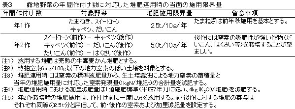 5)以上の結果および既往の知見を勘案し、露地野菜の年間作付け数に対応した堆肥連用時の当面の施用限界量と留意事項を表3に取りまとめた。