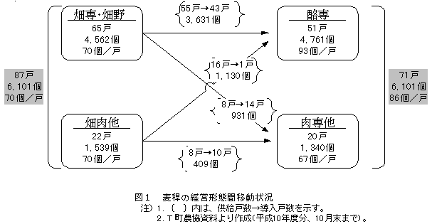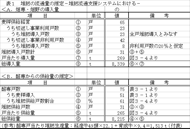 3)酪専経営のうち堆肥を供給しているのは61%程度で、1戸当たり供給量は約265t、また堆肥を導入している畑専・畑野菜経営では1戸当たり約269tを導入している。酪専経営と畑専・畑野菜経営の間の堆肥の総流通量は、約8,300tと推定される。(表1)