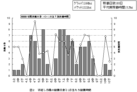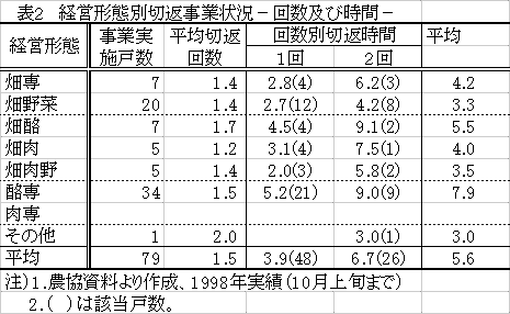 4)堆肥切返しの作業日数は85日、1日当たり作業時間は5.7時間であるが、農協が時期的に集中するように調整している。総作業時間は480時間で、そのうち乳牛飼養経営が60%を占め、1戸当たり作業時間も多い。切返し回数が1回の場合平均作業時間は3.9時間、2回の場合は6.7時間である。(図2、表2)
