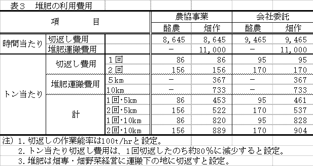 6)本システムにおいて、堆肥を利用するための切返し費用及び運搬費用を試算すると、運搬の必要のない酪専経営では1回切返しの場合85円/t程度、畑専・畑野菜経営では運搬料金の負担が大きく5kmで450円強、10kmでは820円/t程度となった。(表3)