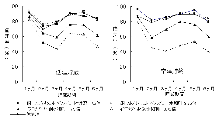 1)室内におけるシャーレを用いた発芽試験において、25℃10日目の発芽率は、貯蔵期間(1〜6ヶ月)、薬剤の種類にかかわらず、いずれも 90%以上で薬剤無処理の種子との差は認められなかった(データ省略)。