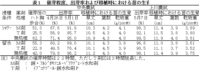 4)ただし、両薬剤処理ともに、ハト胸催芽器によるシャワー加温浸種方式に比べ、留水浸種方式では、無処理よりもやや出芽と苗の生育が遅れる傾向が認められた(表1)。