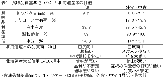 6) 北海道産米を使用する理由は低価格が最も多く、使用しない理由は食味が悪いなどであった。北海道産米に求める品質改善項目は「白度の向上」、「砕け米を少なく」、「粒を大きく」、炊飯米に対しては「うまみ向上」、「老化しにくく」などがあげられた(表1)。