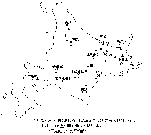 このような背景から育成された「北海83号」は、ジャガイモそうか病に対して強い抵抗性をもつことから、そうか病汚染地での栽培が可能である。また白肉でやや粉質であることから「男爵薯」と同様な調理適性があり、剥皮歩留りが高く変色も少なく長期貯蔵が可能なことから、業務向けとしての利用が可能である。さらにアメリカの主要品種であるラセットバーバンクの孫であり、日本で初めてのラセット皮の品種として外観に特徴があることから、特定販路の可能性がある。「北海83号」を奨励品種に採用することにより、そうか病の発生に不安のあるばれいしょ生産圃場において安定した栽培が可能になるばかりでなく、外観に特徴があることからも、北海道のばれいしょ生産に寄与するものと考える。