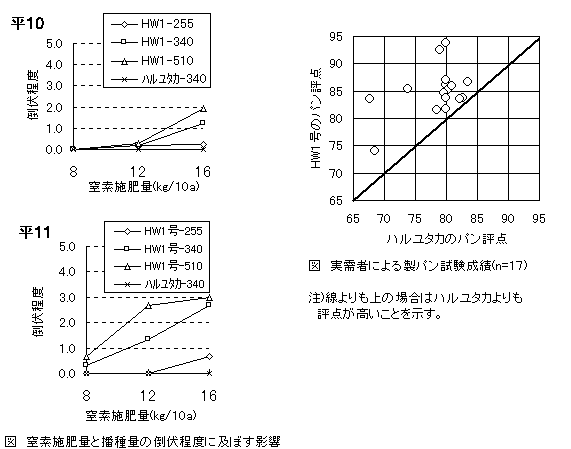 1)耐倒伏性が劣るので標準播種量(340粒/m2)および施肥標準を守り、密植や過度の窒素の施用は避ける。