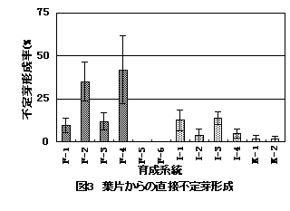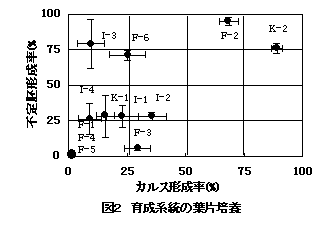 1)北海道農業試験場育成によるてんさいの6自殖種子親系統、4自家不和合性種子親系統、2花粉親 系統の計12系統を用いて、てんさいの組織培養における特性を比較したところ、著しい系統間差異があることが明らかになった(図1、図2、図3)。