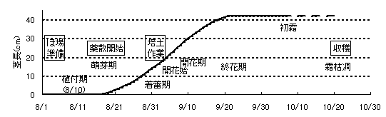 多肥は避け標準肥とし、普通掘りでは標準植〜密植(10a当たり4,500〜5,500株)とし、平均1個重 や規格内歩留まりに留意して収穫するのが望ましい。