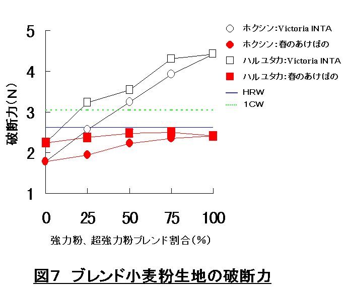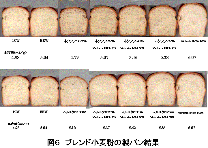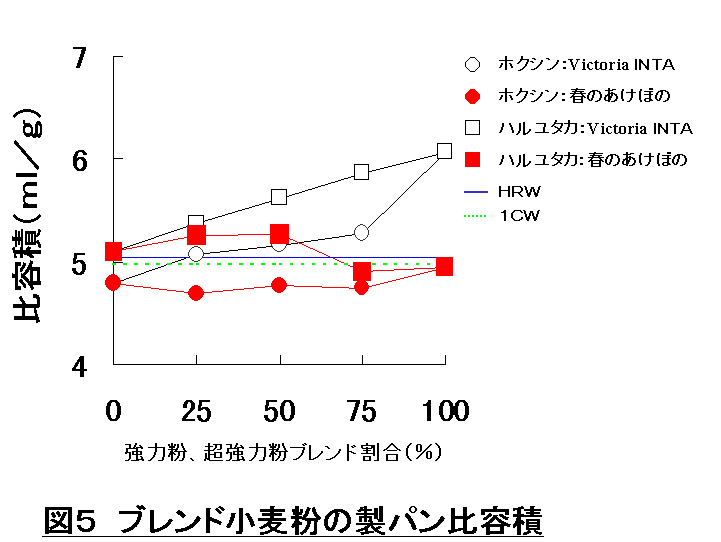 3)超強力粉(Victoria INTA)を適当量ブレンドすることによって、国産中力粉(ホクシン)、準強力粉(ハルユタカ)の比容積、製パン性が向上する(図5,図6)。