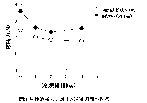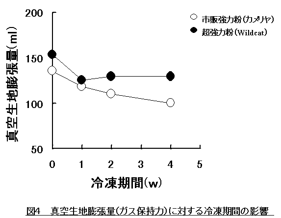 2)超強力粉(Wildcat)に冷凍生地適性がある理由は、冷凍無の超強力粉の生地の破断力(弾性の強い生地物性)、ガス保持性(真空生地膨張量の値の高い生地ほどガス保持力高い)が非常に高く、冷解凍後それらの値は低下はするが、市販強力粉に比べ比較的高い値を維持しているためである(図3、図4)。