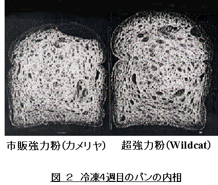 1)超強力粉(Wildcat)の冷凍生地からのパンは、冷凍経時で市販強力粉(日清製粉、カメリヤ)の冷凍生地からのパンに比べ高い比容積を維持し、冷凍生地製パン適性があることが明らかになった(図1,図2)。