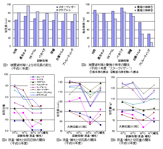 2)遮光ネットは葉焼けの軽減効果があり、短茎開花が著しい‘スターゲイザー’では節間伸長を促進する効果も認められた(図1,2)。また、深植や白黒マルチ、プレルーティングを行うことも葉焼け発生の軽減に有効であった(図2)。