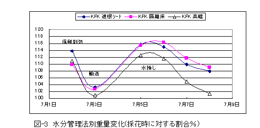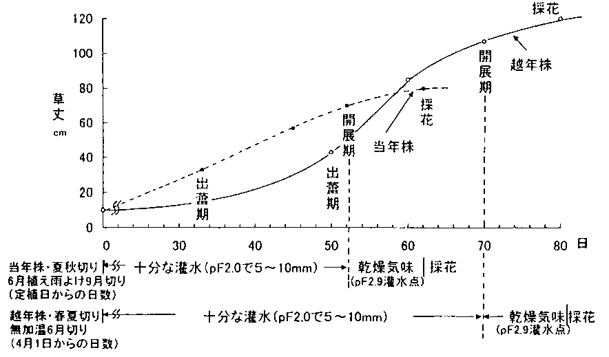 2)栽培方式や作型に応じた水分管理法の確立:排水不良な圃場については隔離床、遮根シートが有効であり、これらの栽培法では開花枝展開期までの灌水によって調製重や切花長の低下をできるだけ抑え、日持ち性を向上させることができる。その場合の水管理として、定植後は水を充分補給するためpF2.0程度を灌水の開始点とし、1回の灌水量は生育状況によって5〜10㎜で調節する。また、開花枝展開期以降はpF3.0程度を灌水の開始点とし、乾燥気味に管理する。