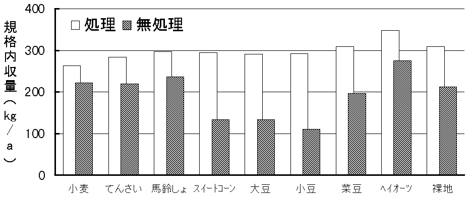 ①規格内収量は、前作にヘイオーツを休閑緑肥として栽培した場合がもっとも高い収量を示した。他の畑作物を前作として栽培した場合にはほとんど収量差はなかった。
