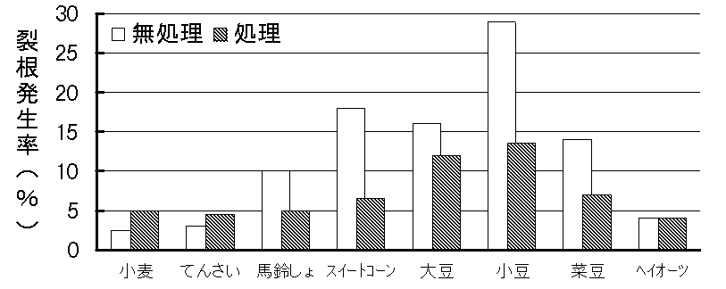 ③殺センチュウ剤を使用しない場合の規格内収量はスイートコーン後および豆類後において裂根が多く発生したため、相対的に裂根発生の少なかったばれいしょ・小麦・ヘイオーツ・てんさい後で高くなった(表2)。この裂根はおもに根の肥大中期頃に発生したと推定され、組織がすでに木質化しているものが多かった。