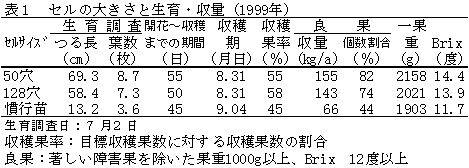 1)セルの大きさ 大きさの異なるセル(50穴、128穴)の発芽後の生育、根の伸長性、移植後の生育、ほ場における生育・収量について慣行育苗した苗と比較検討。供試培土:スーパーセルトップV。供試品種 「キングナイン」(以下の試験に共通)