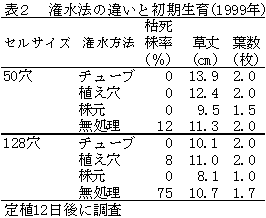 2)セル苗の活着性 活着および初期生育は、移植後の潅水により向上した。活着の促進には、土壌水分が適正な時期にマルチングを行い、さらに定植前の植え穴潅水(200ml)、または株もと近くへの潅水チューブによる潅水が有効であった(表2)。