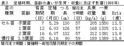 3)定植時期と苗齢 6月上〜中旬に定植したセル苗の生育・収量・品質は慣行苗に比べ同等以上の結果が得られた(表3)。両性花開花期までの期間を慣行育苗した苗と比較すると、播種期が同じならばセル苗は3〜6日早くなり、播種期が遅くなるほど、また苗齢の小さいセル苗ほど短縮された。