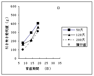 1)セルの大きさ セル内の培土量が多い50穴苗は、生育、根張りが128穴よりも良好であった(図1)。移植後の根の伸長も50穴苗が優った。ほ場での生育は50穴苗が良好であった。総体的に収量は低かったが、セル苗の収量は慣行苗に比べて優った(表1)。 なお、慣行苗は開花期に降雨の影響を受けて収量は低かった。