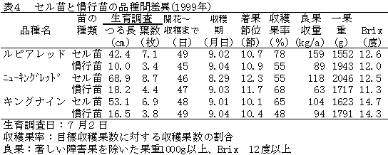 4)品種間差異 草勢の強い「ニューキングレッド」でセル苗の着果節位がやや上昇したが、同一品種内ではセル苗、慣行苗とも肉眼観察による差はなかった(表4)。各品種とも、収量・品質はセル苗が優った。