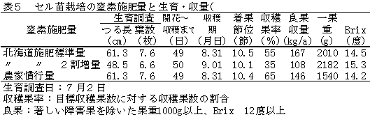 5)窒素施肥量 北海道施肥標準の窒素量を施肥した区は農家慣行および増肥区に比較して生育・収量・品質が優った(表5)。特に、北海道施肥標準量を超えた窒素施用区では生育・収量が劣った。